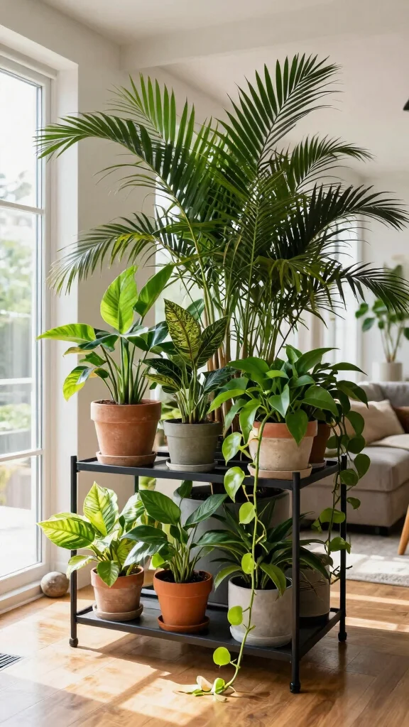 To maximize your urban jungle, use cascading plants on the top shelf to draw the eye upwards, creating a sense of verticality. Select a variety of plant sizes to achieve depth and visual interest. You can also incorporate small decorative items like pebbles or shells to add a natural touch, making the display more inviting.