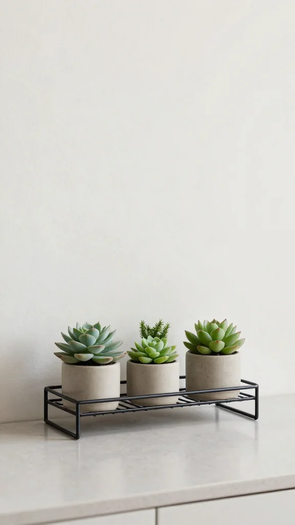 For a successful minimalist display, choose a monochromatic palette with one or two accent colors to maintain harmony. Limit decorative items to essentials, perhaps a simple vase or a smooth stone, to uphold the uncluttered aesthetic. Keeping your plants small yet healthy allows you to add greenery while preserving a spacious feel.