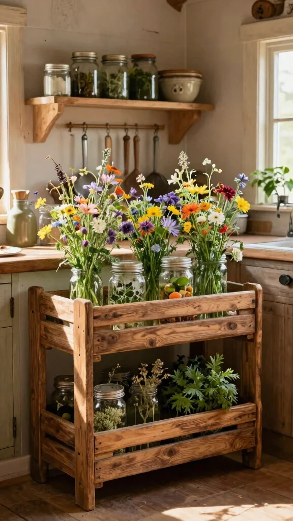 Capture the essence of a rustic farmhouse with a baker’s rack crafted from reclaimed wood. Fill it with wildflowers, herbs, and seasonal decor to create a cozy kitchen atmosphere where fresh ingredients are always within reach. This appealing setup brings a touch of the countryside into your home, enriching your cooking experience.