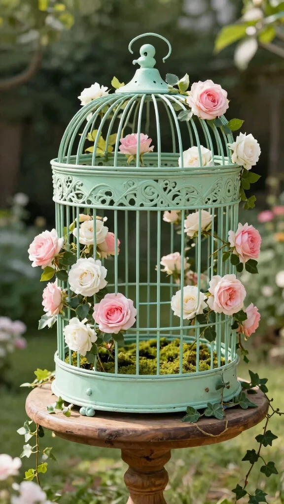 Imagine turning a simple bird cage into a charming vintage rose garden. Picture a delicate cage painted in soft pastel hues like mint green or blush pink, capturing a romantic vibe that invites admiration. Fill it with an enchanting mix of climbing roses and trailing ivy, creating a lush, layered spectacle that appeals to the senses with its vibrant colors and delightful fragrance.
