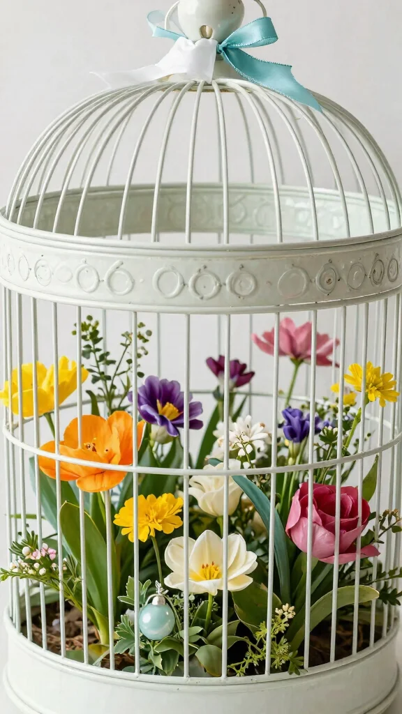 Layer the flowers inside the cage, placing taller blooms in the back and shorter ones in the front. This creates depth and ensures each flower has its moment to shine. A vintage bird cage centerpiece is perfect for garden parties or as a unique focal point in your flower garden.