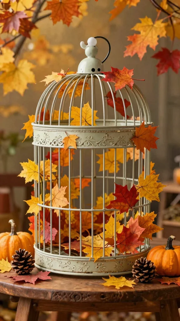 Celebrate the changing seasons by transforming a bird cage into a captivating autumn display. Fill the cage with colorful autumn leaves, small pumpkins, and rustic pinecones, creating a warm and inviting showcase that embodies the spirit of fall.