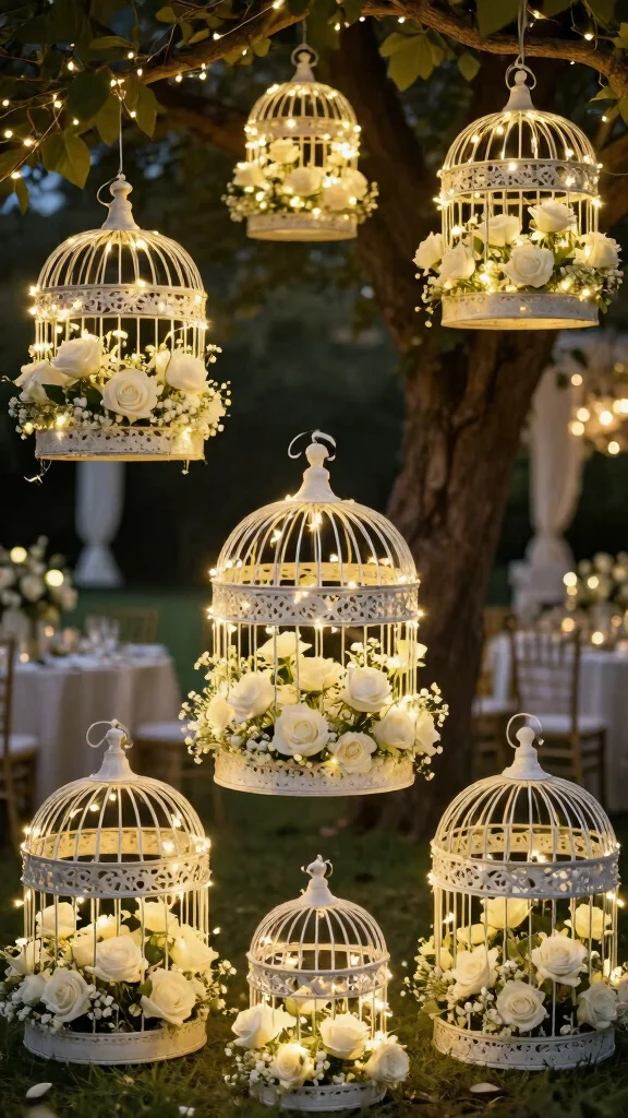 This enchanting design creates an ethereal atmosphere suitable for outdoor ceremonies or receptions. Hang the cages from trees or use them as table centerpieces, enhancing the romantic vibe. Adding touches of greenery around the bases ties the entire look together beautifully.