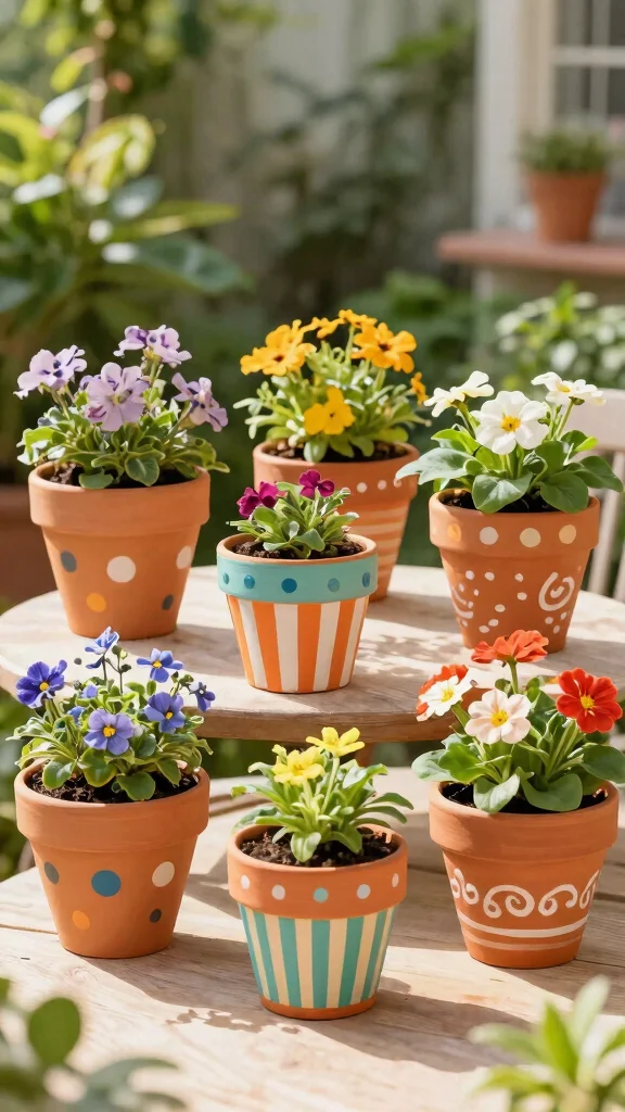 Unleash your creativity with playful paint and patterns on clay flower pots, adding vibrancy to your garden or home! This concept allows you to express your personality while brightening up your space with colorful designs, from polka dots to stripes.