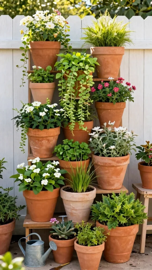 Create an eye-catching vertical garden with stacking clay flower pots, perfect for maximizing space in small balconies or patios. This design allows for a lush display of plants, combining various pot sizes and colors to form a striking visual element. It’s an ideal solution for those with limited horizontal space who still want a vibrant garden.
