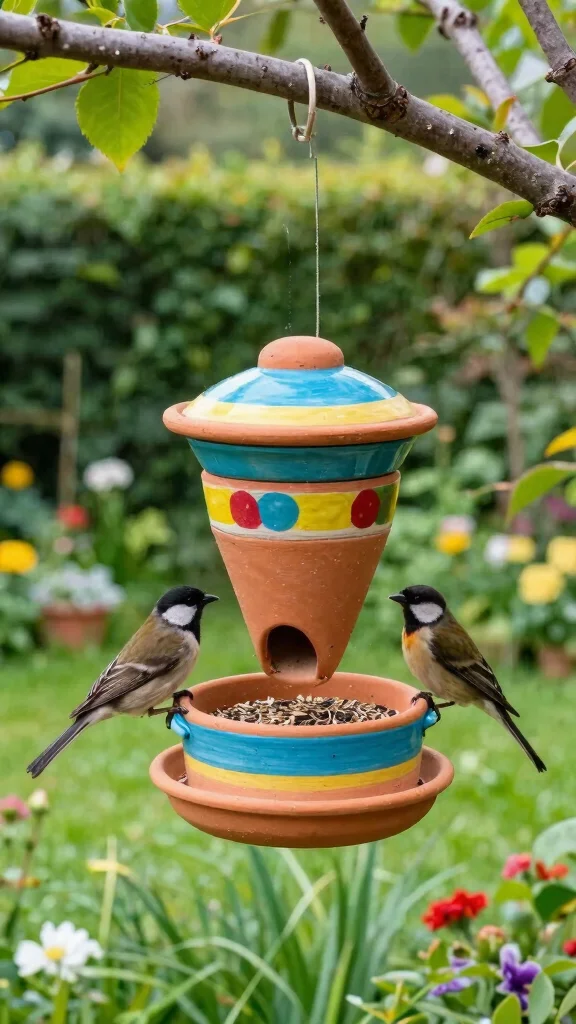 Begin with a larger pot for the base and a smaller one for the top feeder. Paint them in cheerful colors and securely attach the smaller pot upside down on the larger one. Fill the larger pot with birdseed and hang it in your garden to enjoy watching the birds.