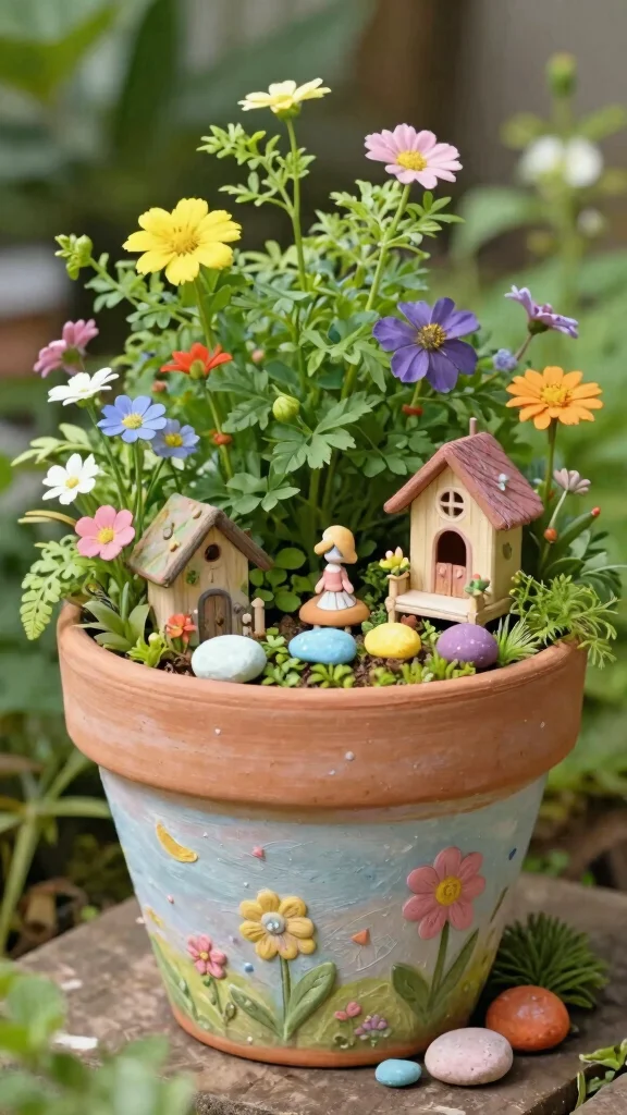 Start with a medium-sized pot as your base, decorating it with miniature fairy houses, figurines, and vibrant flowers. Painting the pot adds a magical touch, and you can easily change the scene according to the seasons or your creativity.
