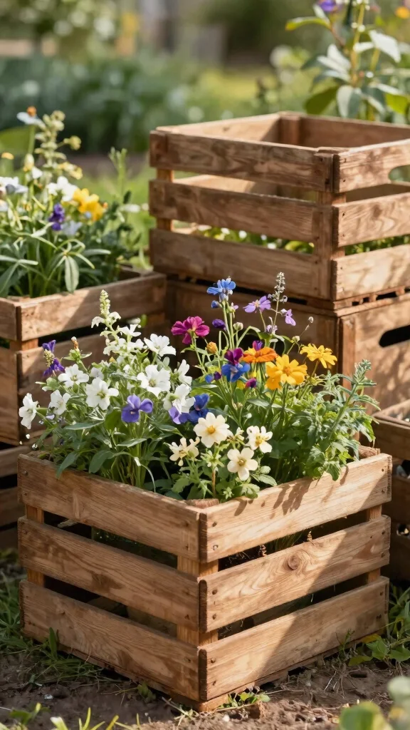 Wooden crates are a versatile and stylish option for creating unique planters in your garden. Their rustic charm adds character, making them ideal for both flowers and edible plants. You can personalize them by stacking or painting to match your outdoor theme, giving your garden a cohesive look. Imagine a tiered display bursting with colorful blooms or fresh herbs, transforming your garden into a vibrant oasis.