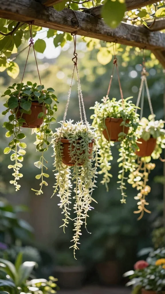 Consider using macramé hangers for a bohemian flair and mix different plant types to maintain visual interest. Hanging at varied heights adds a dynamic touch and keeps your garden looking lively throughout the seasons.