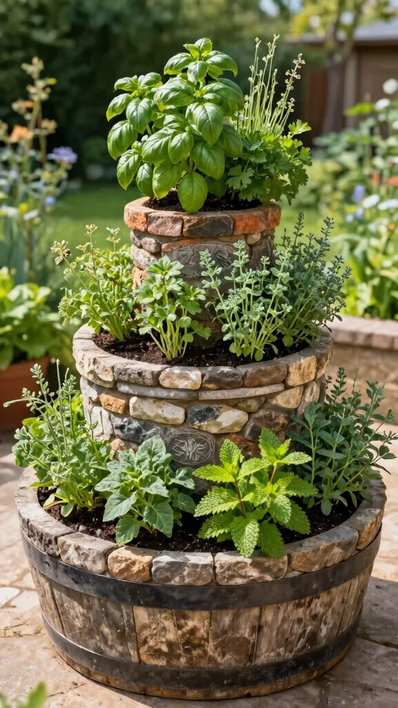 Looking for a creative way to maximize planting space? A rustic herb spiral in your half barrel planter is an innovative solution! This vertical design allows for different microclimates, letting taller herbs thrive at the top while shorter ones flourish at the base.