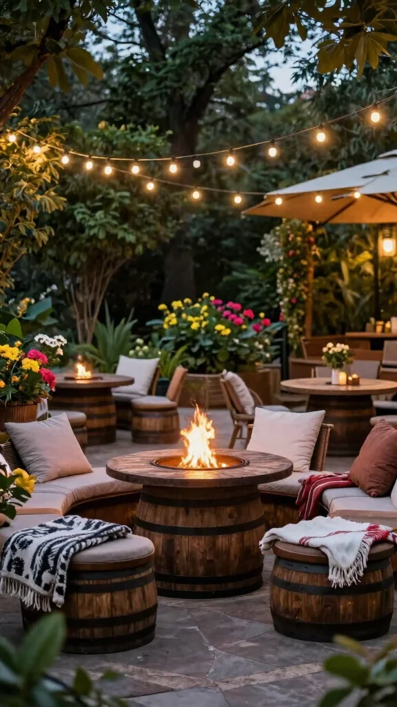 This setup creates a warm atmosphere perfect for gatherings or quiet evenings. Adding cushions or soft blankets on the barrels enhances comfort, making your outdoor space both inviting and practical.