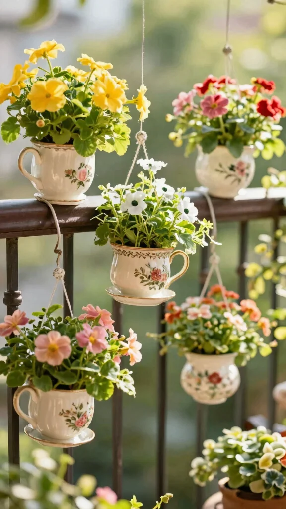 Vintage tea cup planters not only serve as conversation starters but also bring character and charm to your balcony garden!