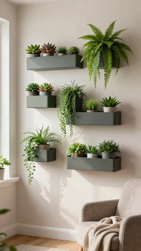 This setup maximizes your vertical space while adding a decorative element to your walls, turning your plants into a part of your home decor.