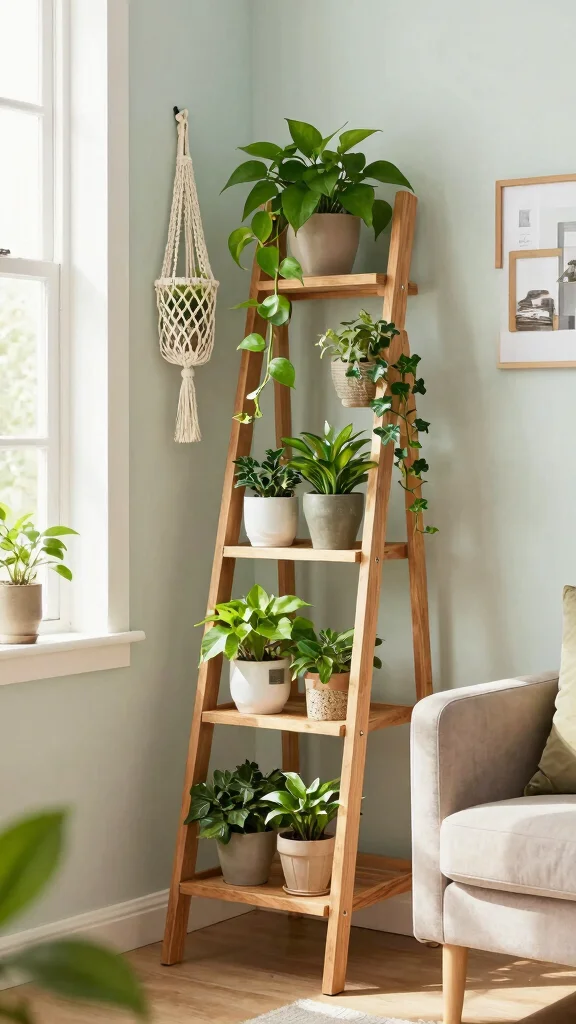 Elevate your greenery with a ladder plant stand, creating a visually appealing display in otherwise awkward corners.