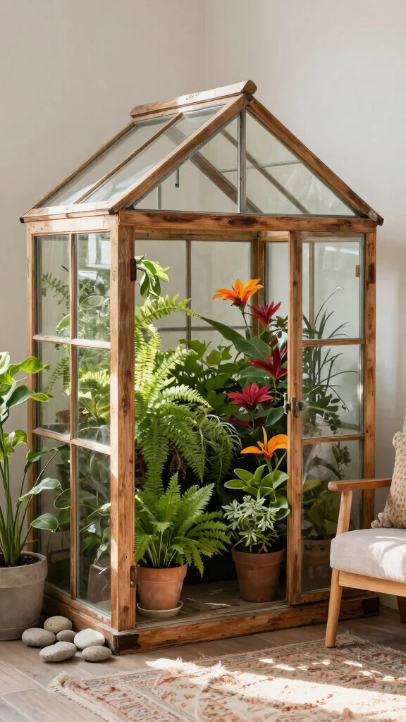 This charming design not only optimizes your corner but also creates a peaceful oasis at home. The combination of plants and the greenhouse structure enhances your indoor gardening experience.