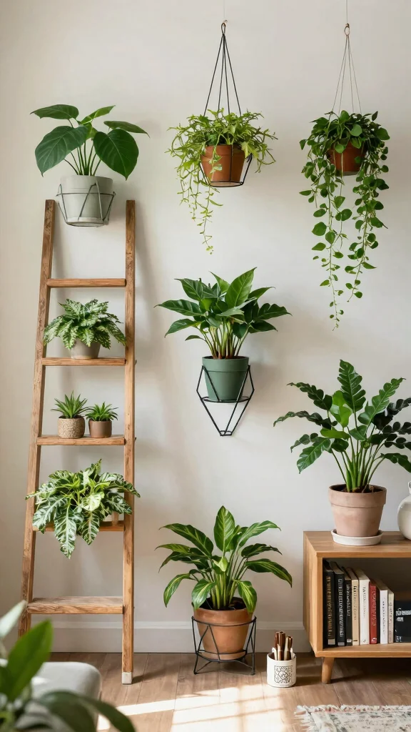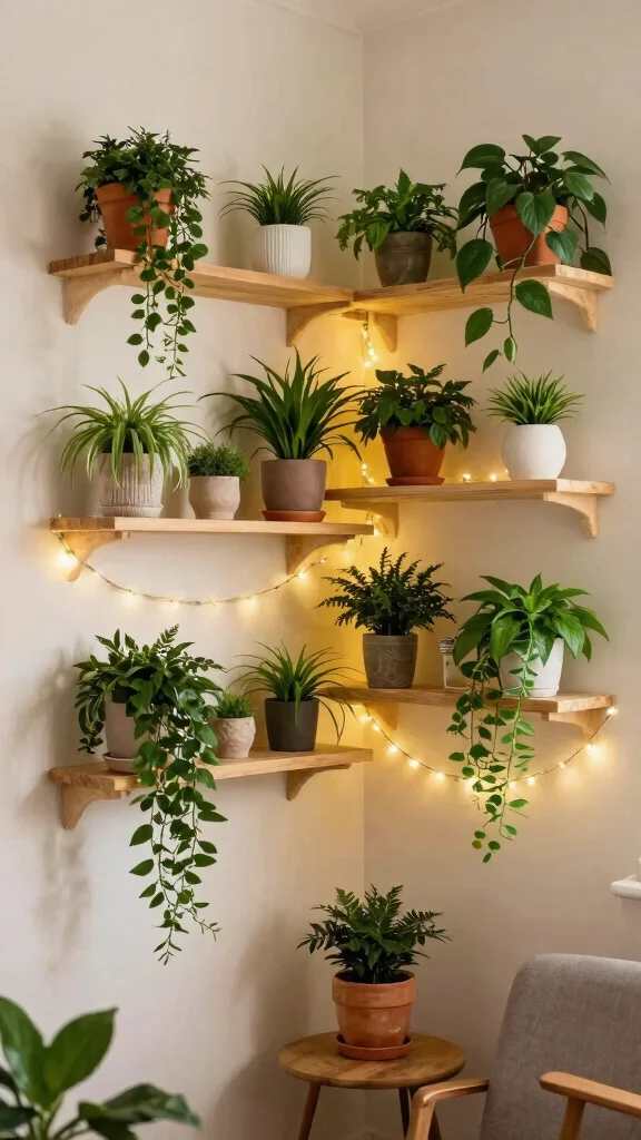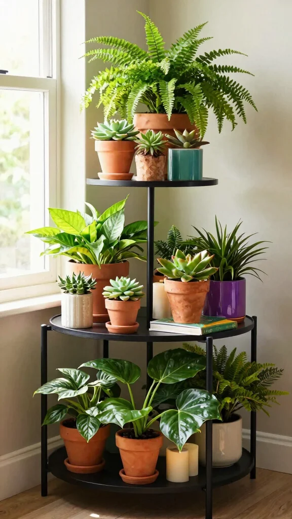 Use multi-tiered plant stands or wall-mounted shelves to efficiently utilize vertical corners in your home.