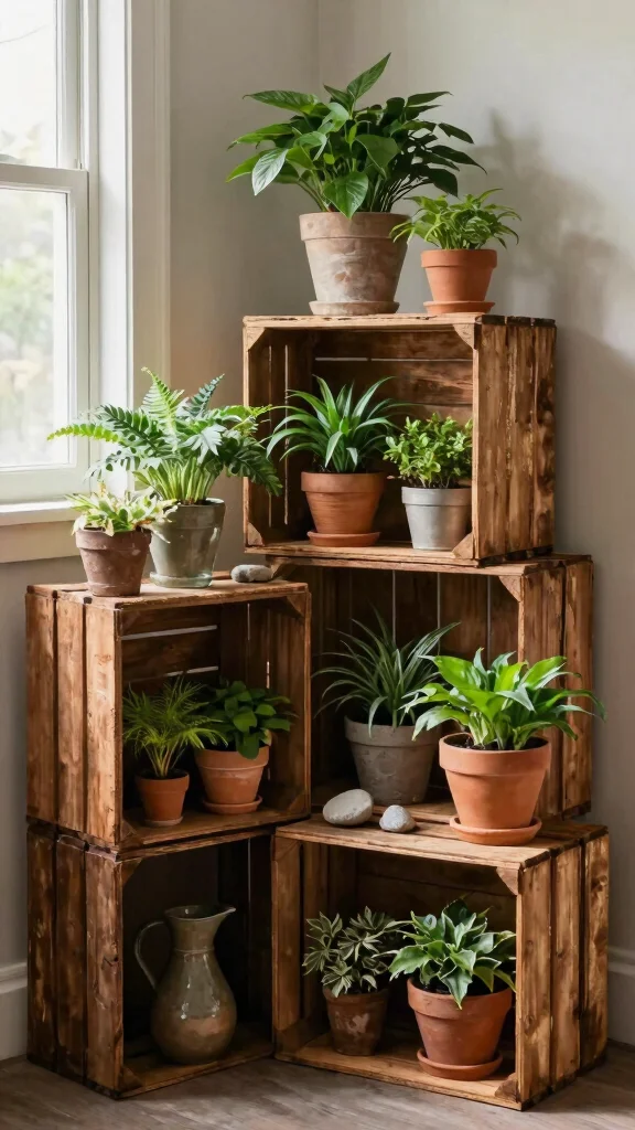 4. Rustic Crate Display: Farmhouse Vibes in Your Corner