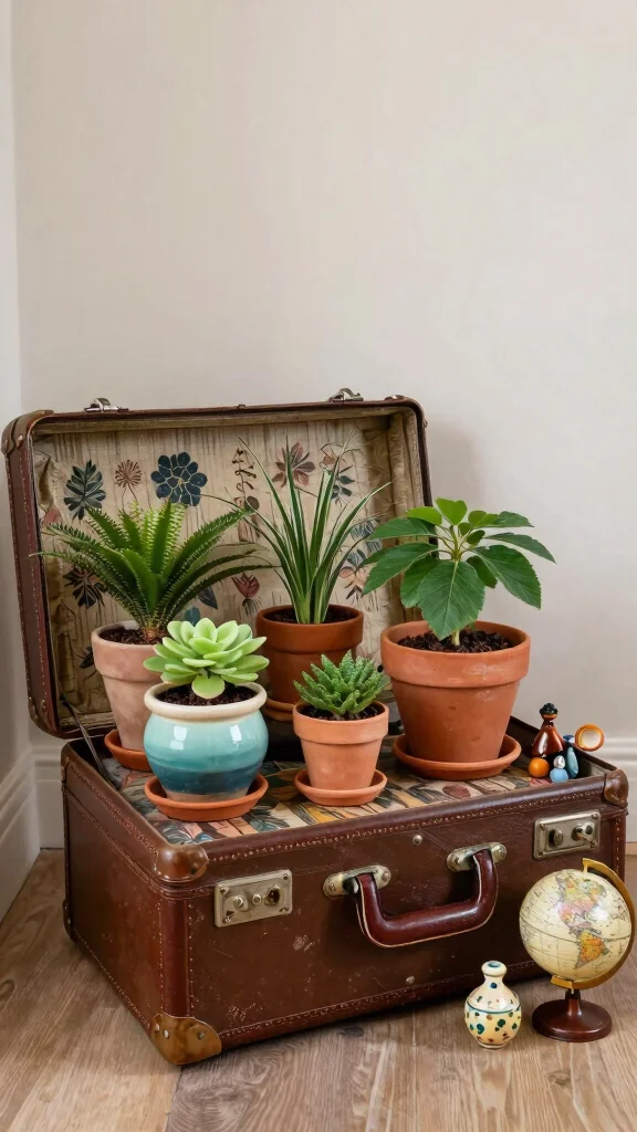Choose plants that thrive in the suitcase’s natural environment—cacti or succulents work wonderfully. Placing the suitcase near a window ensures adequate sunlight for your plants.