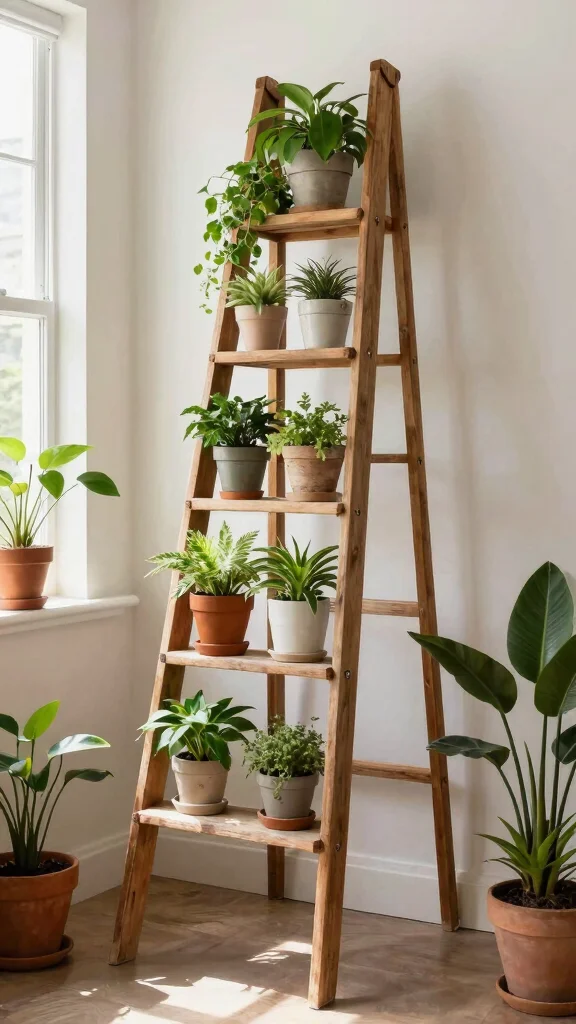 Mix tradition and modernity with a vintage ladder plant stand. Repurposed wooden ladders can become charming displays that add character to your home. You can paint it in a vibrant hue or leave it as is for an authentic rustic look, showcasing plants in whimsical pots.