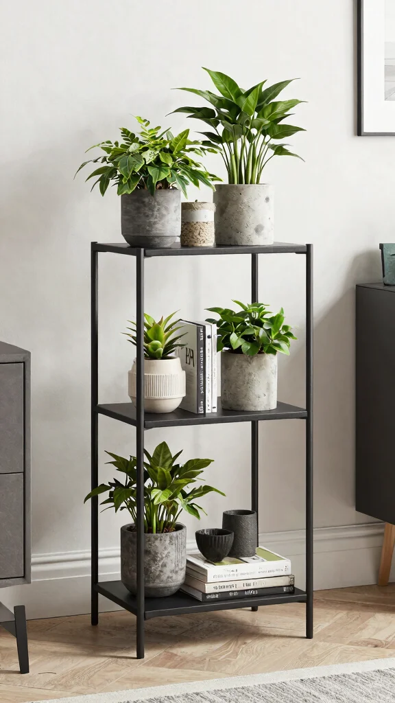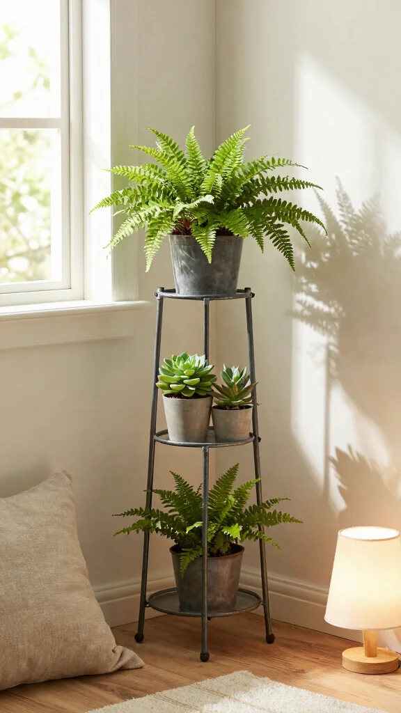 These stands elevate plants off the ground, creating an eye-catching vertical garden effect. They can easily hold smaller pots, allowing for a creative mix of plants that enliven your space.