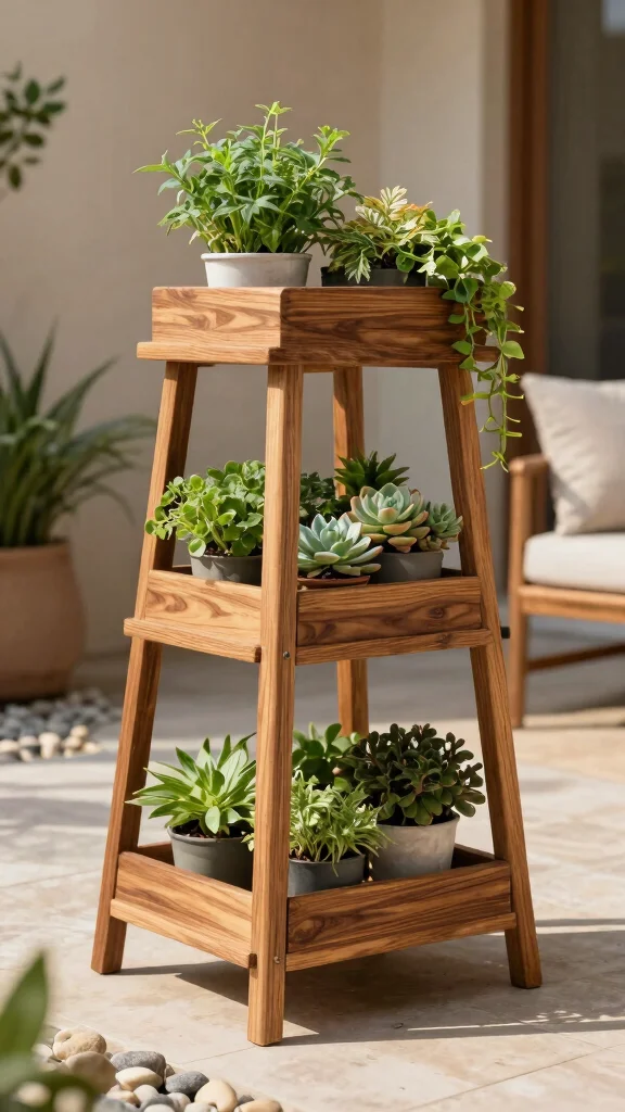 Utilize tiered wooden plant stands to maximize vertical space and display multiple plants effectively.