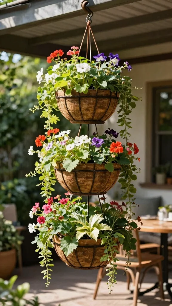 Employ multi-tier hanging baskets to create a lush, layered look and optimize vertical gardening space.