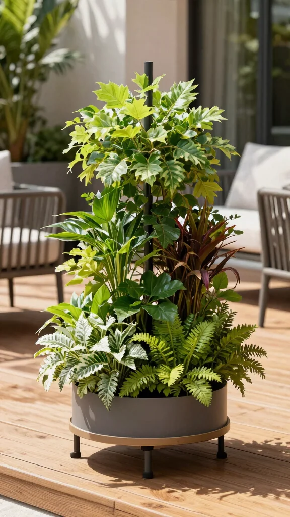 When selecting your stand, choose a design with wheels for easy mobility, and ensure it can support the weight of your larger plants. This functional piece adds a unique element to your patio garden, making plant care a breeze.