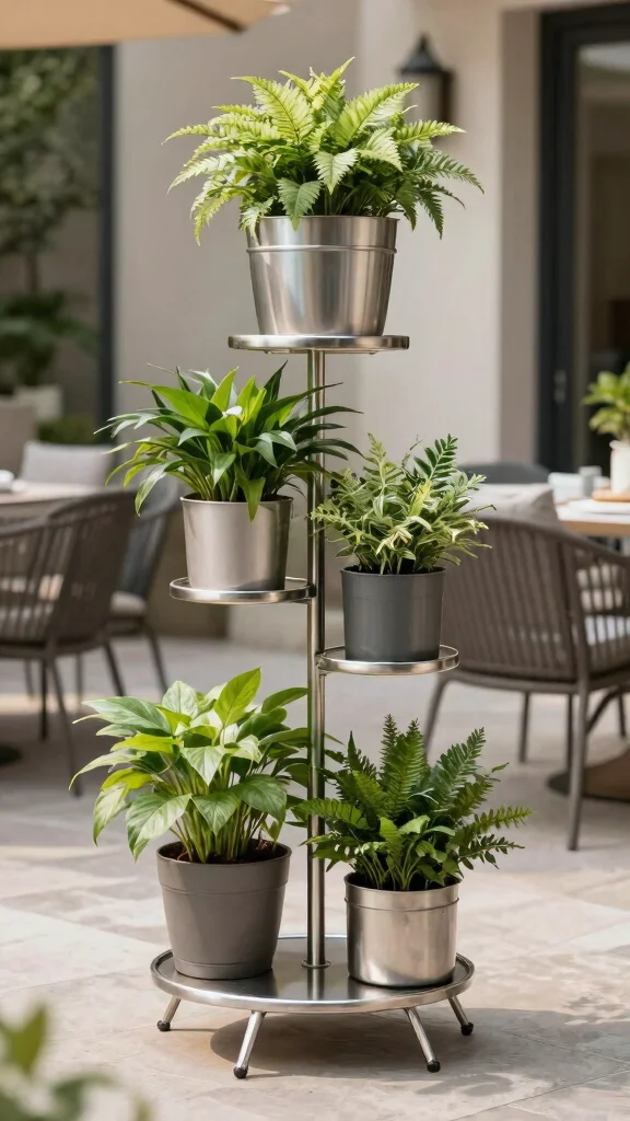 An elegant metal plant stand adds a sophisticated touch to your patio while providing a durable option for showcasing your plants. Available in various styles, metal stands can seamlessly fit into any decor theme, from modern to industrial. Imagine a sleek metal structure supporting your favorite pots, enhancing the overall aesthetic of your garden.