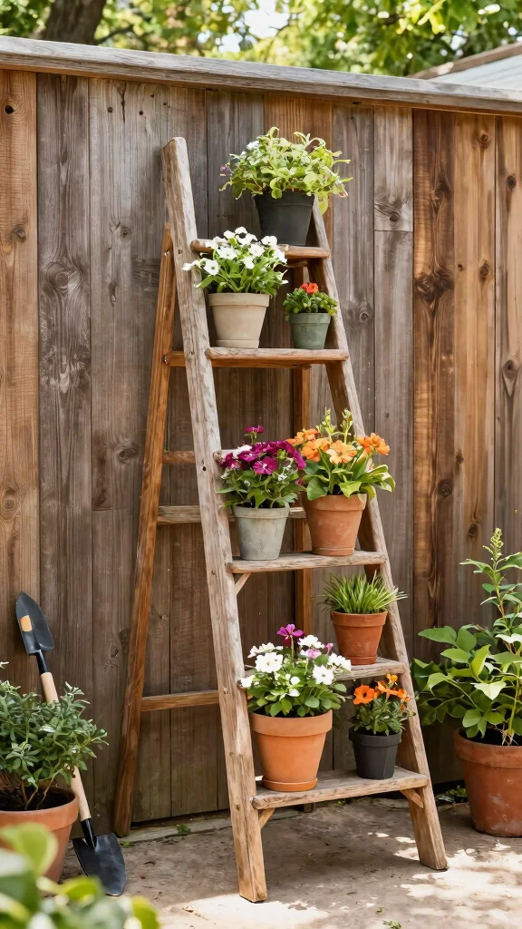 To ensure safety and stability, secure the ladder to a wall or heavy base, and consider painting or staining it to match the rest of your outdoor decor. This sustainable option not only breathes new life into old furniture but also connects you to nature in a playful way.