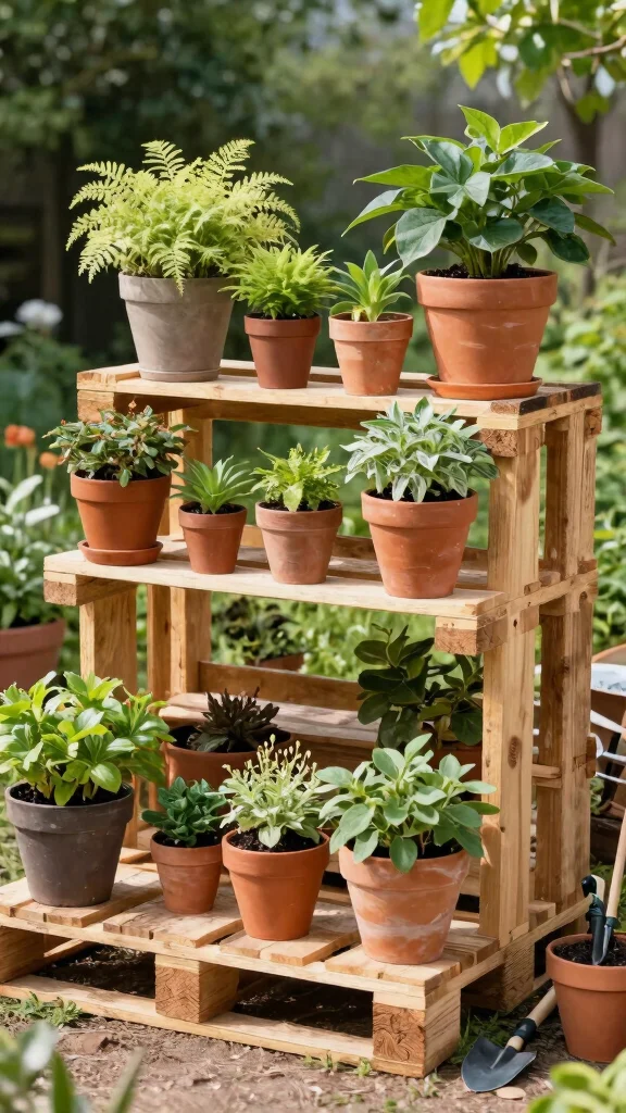 Repurpose old pallets into stylish plant stands for an eco-friendly and budget-friendly gardening solution.