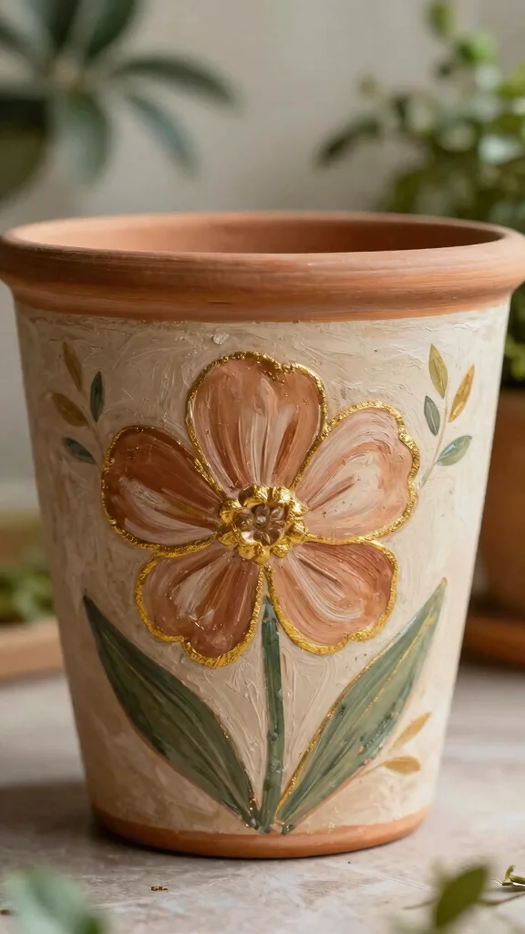 To bring this style to life, choose high-quality acrylic paints that reflect your vision. You can easily find budget-friendly terracotta pots at local garden centers or craft stores. This look connects you to nature, offering a cozy and artistic vibe that enhances your outdoor space.