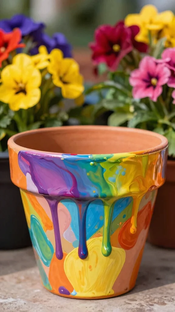 Fun fact: with just 3 colors and one tilted pour, you can craft a drip pot in under 15 minutes. Keep layering, and your painted flower pots ideas become a bold, one-of-a-kind piece of garden art.