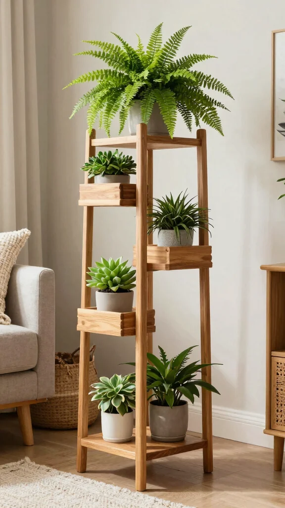 Integrating a multi-tiered stand enriches your living room, showcasing the beauty of your greenery while maintaining a harmonious atmosphere.