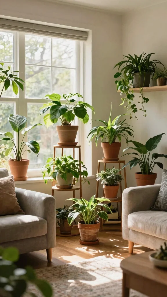 To maximize this setup, select a stand that complements your existing furniture style. Arrange plants of varying heights to create visual interest, and consider using trailing varieties to soften the stand’s edges. This approach not only enhances aesthetics but also makes your living room feel more complete.