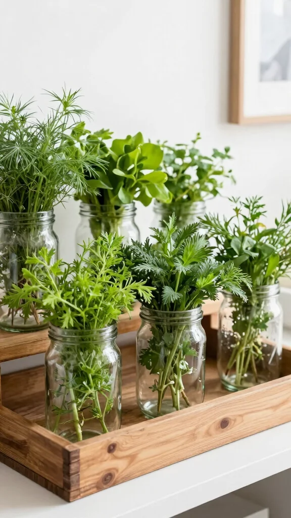 Use various sizes and shapes of glass jars to introduce variety into your display. Fill each jar with potting soil and small plants like herbs or succulents. Arrange them on a vintage tray or a wooden board for a coordinated look that can serve as a stunning centerpiece or a charming windowsill display.