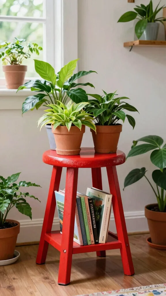 Start by refreshing the stool with a new coat of paint or stain to brighten it up. Choose a bold color that contrasts with your plants or a subtle shade that complements them. Set your plants on the stool’s seat, or use a lower shelf for pots or gardening supplies.