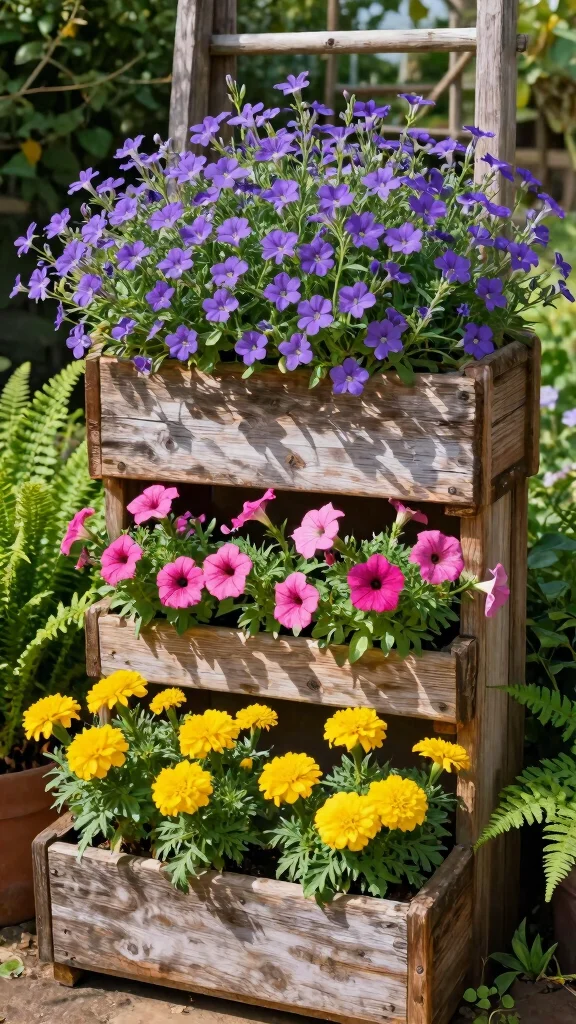 To get started, think about using reclaimed wood for a rustic feel or sleek metal for a modern touch. Layer your planting with delicate lobelia at the top and bold petunias below for a captivating effect.
