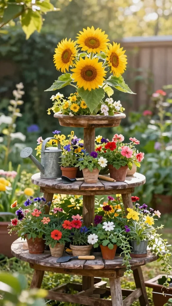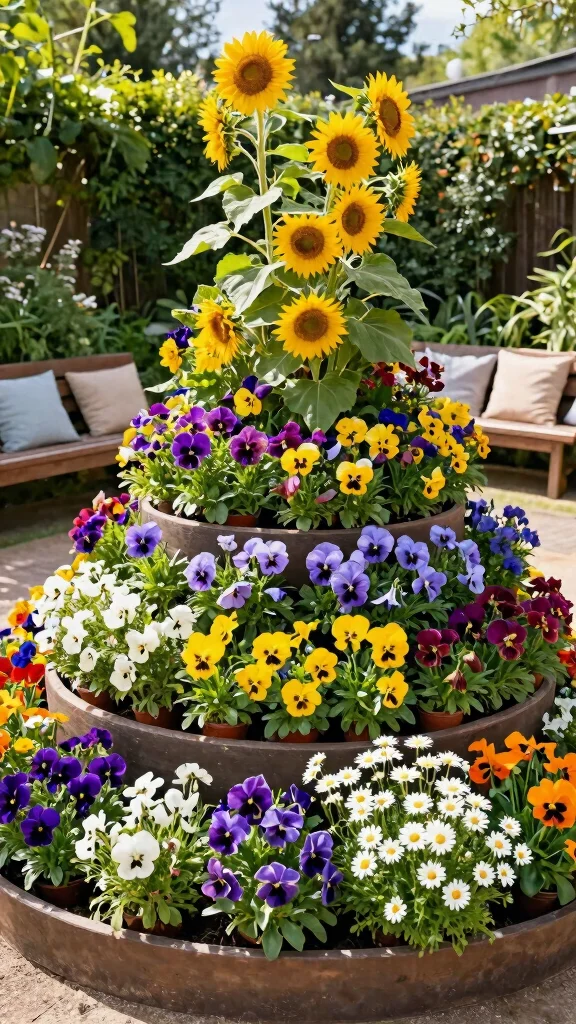 Want a creative way to showcase a variety of flowers? A multi-tiered planting system is perfect for conserving space while providing a stunning floral display. Each tier hosts different flowers, making it ideal for small gardens or patios where vertical space is limited.
