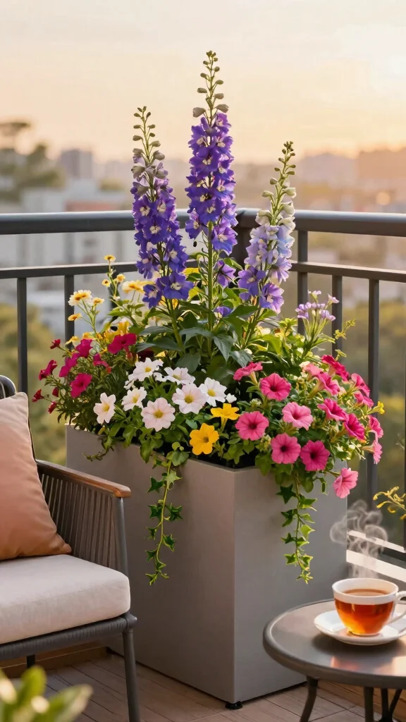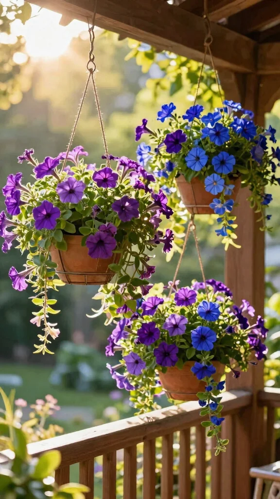 Select plants that drape over the sides, like petunias and lobelias, to create depth and visual interest. This setup allows you to maximize your vertical space effectively.