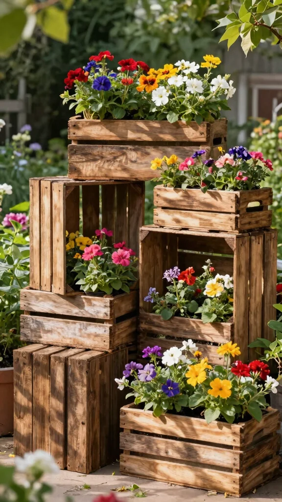 Want to add charm to your garden? Rustic crate planter boxes bring an old-world feel while providing a practical planting solution. These crates can be stacked or used individually, allowing for layered flower displays with distinct varieties.