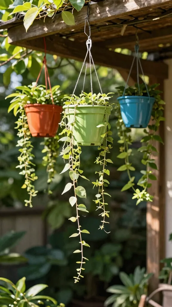 A hanging pot garden made from recycled plastic flower pots can add lush greenery without crowding your patio—just drill, string, and go. Ivy and petunias cascade from a pergola, bringing your space to life.