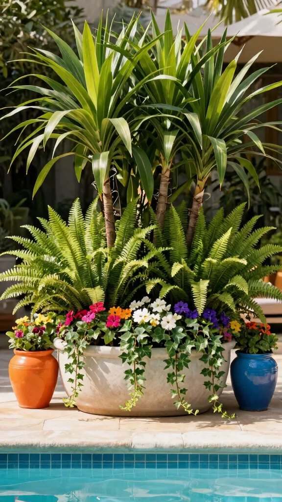 – Key features: Ferns add a soft, lush look to your pool area. Their feathery fronds create a tropical vibe and they generally require minimal maintenance.