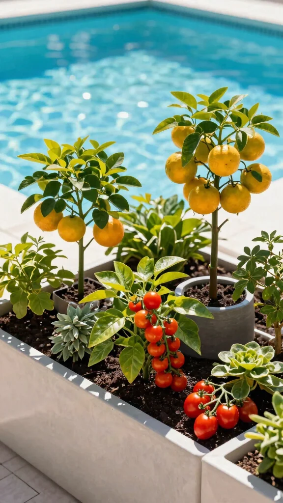 Combine beauty and functionality by creating a poolside edible garden. Include a variety of tropical fruits and vegetables, such as dwarf citrus trees or cherry tomatoes, which serve as both delicious snacks and vibrant decorations. Choose stylish planters that complement your outdoor decor, keeping the look cohesive.