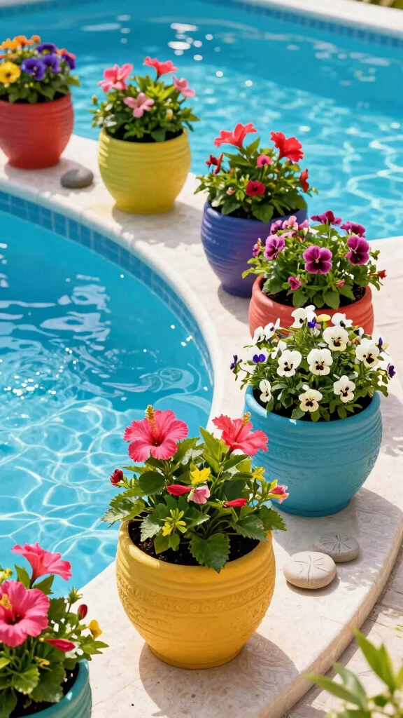 Ceramic pots provide excellent drainage while retaining moisture, benefiting your plants. Cluster them together for a dynamic arrangement, using contrasting colors to make a statement against your pool’s blue water.