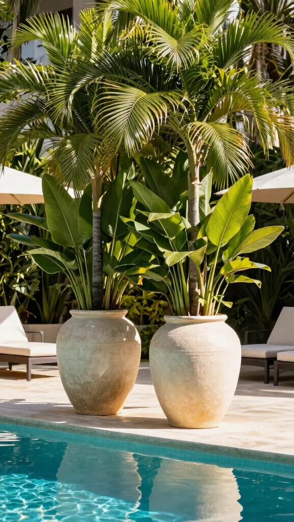 Make a bold impression with large statement planters that create a stunning focal point around your pool. Imagine oversized pots filled with striking tropical plants like palms or dracaenas, enhancing the luxurious atmosphere. Position these planters at corners or along pathways to welcome guests into your verdant retreat.