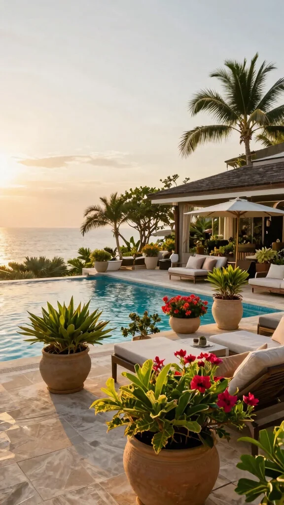Which outdoor planters and tropical plants are best for a lush poolside design?