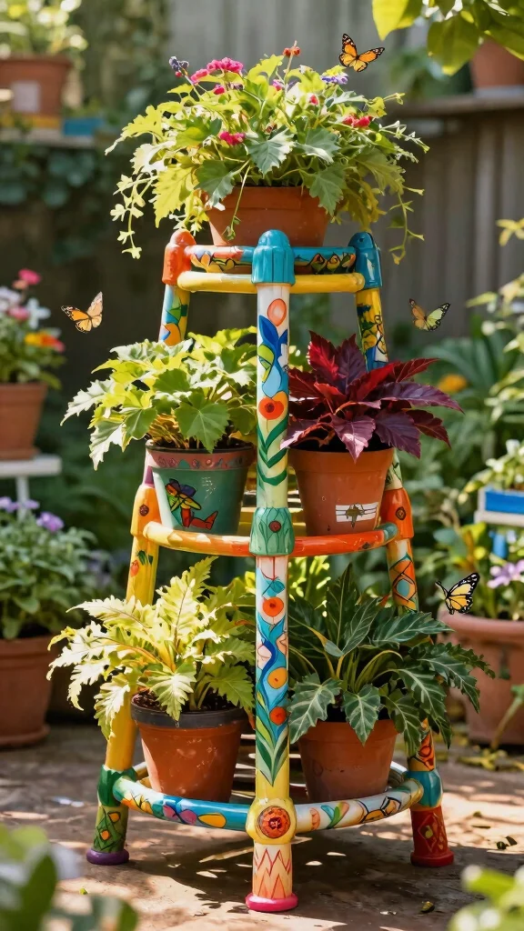 Add a personal touch to your garden with a decorative PVC plant stand featuring unique patterns. Whether painted or crafted with cut-outs, these designs can elevate your stand into a striking garden feature. Imagine your plants showcased against a backdrop of vibrant colors and creative shapes, captivating the attention of all who pass by.