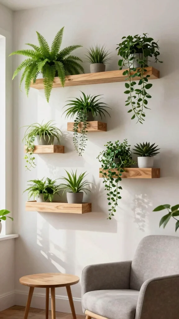To maximize the effectiveness of wall shelves, install them near windows where plants can soak up sunlight. Mixing different shelf sizes can create an engaging layout that draws the eye across the wall. Plus, you have the freedom to change your plant placements easily, keeping your decor fresh and lively.