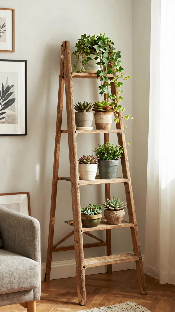 Multi-tiered ladder stands maximize your plant display without taking too much space. They offer both functionality and style, easily adapting to your changing decor needs.
