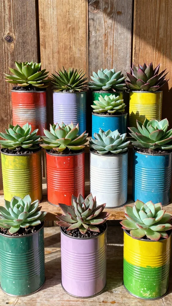 After removing labels and cleaning the cans thoroughly, consider painting them or leaving them as-is for a vintage look. Make sure to poke holes in the bottom for drainage, then fill with soil and your favorite succulents. These cans can be clustered on a shelf or hung on a wall for a creative garden effect.